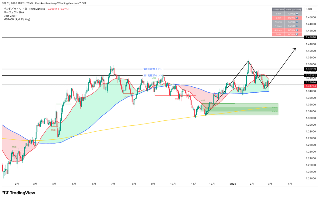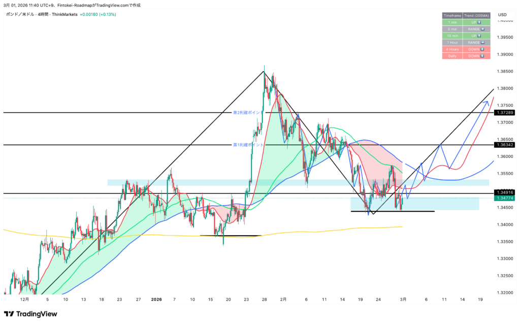 1.3410付近(4H直近安値)を実体で下抜け確定した場合、ロングシナリオは一旦棄却。日足レベルでのより深い調整(全戻し)を警戒します。