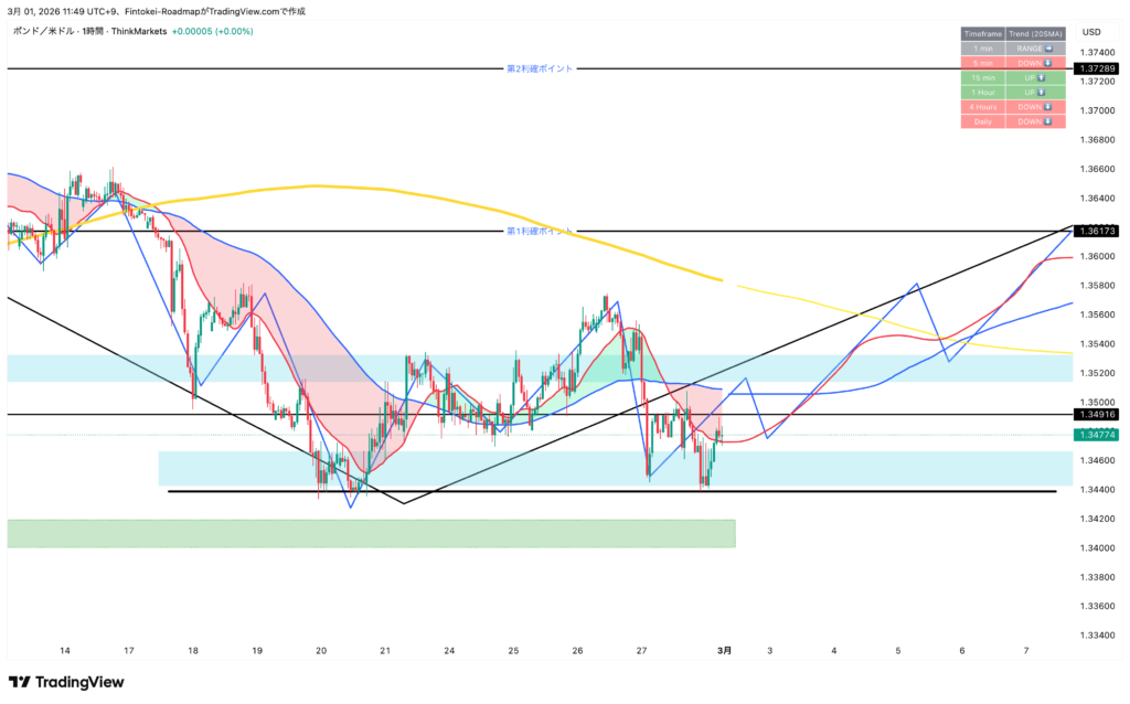 その後、1.3480〜1.3500付近への押し目を形成し、安値切り上げなどの時間足ごとにトレンド転換が確認できればロングイン。