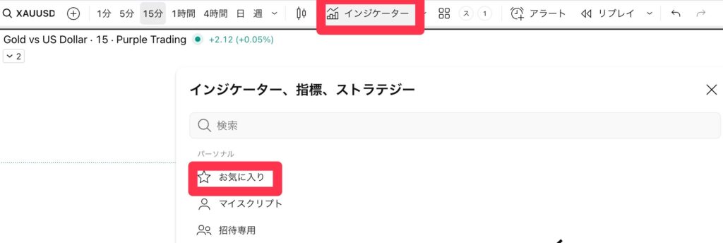 自分のチャート画面に戻り、上部メニューの「インジケーター」を選択。